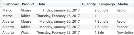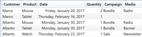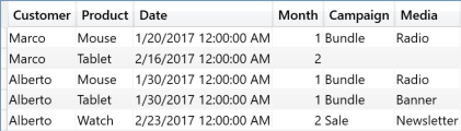 Nesse caso, todas as linhas correspondentes na tabela Promo são retornadas e SELECTCOLUMNS retorna apenas as colunas Campanha e Mídia desejadas, ocultando as colunas Mês e Produto que seriam apenas redundantes. Você pode usar essa abordagem como uma maneira de unir duas tabelas usando várias colunas. No entanto, ao usar GENERATE você não vê no resultado as linhas em Sales que não possuem linhas correspondentes em Promo. Na verdade, o resultado anterior tem apenas quatro linhas em vez de cinco.